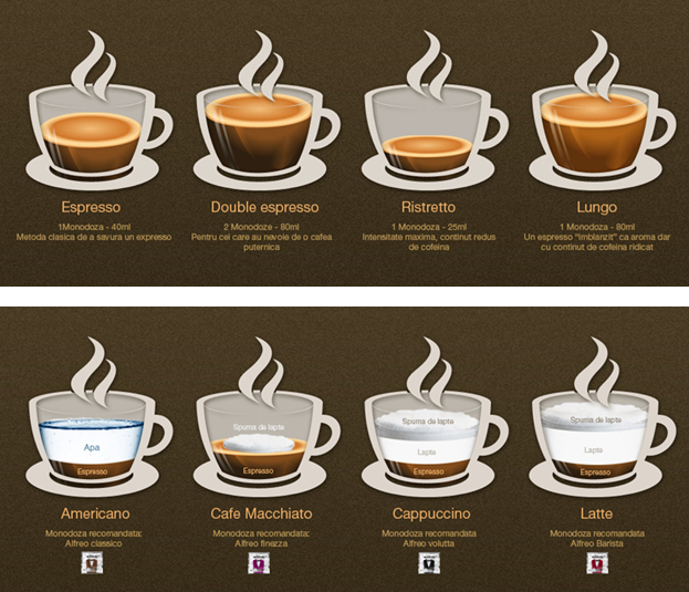 Numele deja spune totul: în limba italiană, un espresso este sinonim cu “făcut pe loc”. Pentru cunoscători, espresso-ul reprezintă esența preparării cafelei: o licoare bogată, plină de arome și în același timp catifelată, cu un strat natural de cremă ce acoperă lichidul echilibrat și intens de sub ea. Formula autentică de preparare a unui espresso, desi simplă la prima vedere, ține nu doar de execuție și experiența ci și de talent. Un jet de apă fierbinte trece cu presiune de peste nouă atmosfere prin șapte grame de cafea măcinată și presată în filtru. Rezultatul: nu mai mult de 30 de ml de pură plăcere senzorială. Arta unui barista stă în rafinamentul măcinării, în cantitatea de cafea pusă cu precizie alchimică în filtru, în presiunea cu care jetul de apă infiltrează cafeaua, în timpul de curgere, în temperatura apei, în pregătirea și încălzirea ceștii în care va fi savurată cafeaua. În toți acești pași, perfecțiunea este atinsă doar prin echilibru. Această metodă face din espresso o băutură intensă, cremoasă și aromată cu un bogat conținut de substanțe benefice organismului și puțină cofeină. Contrar opiniei populare, cu cât o cafea este mai scurtă, cu atât este mai sănătoasă.